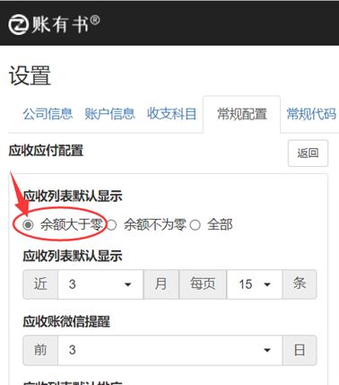 设置默认仅显示“应收余额大于零”的应收账款。