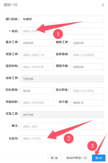 进入“做工资”页面,勾选其中一行,点击“添加一行”,系统将复制该行数据生成新纪录,补充“姓名”、“手机号”等主要信息后,即可保存,减少录入工作量,下图所示: