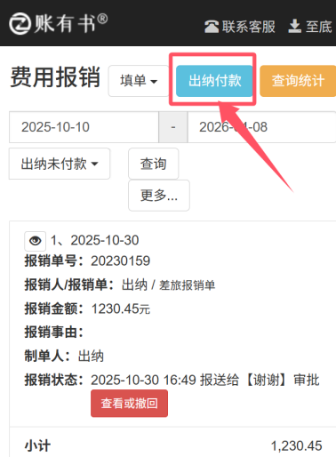 1、出纳登录账有书,进入【费用报销】 模块;点击右上角 【出纳付款】 按钮,下图所示:
