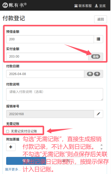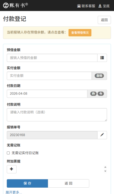 第二步:付款登记,核销预借 / 录入实付金额