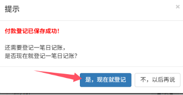 1. 保存付款后,系统弹出 “是否登记日记账” 提示,点击 【是,现在就登记】;下图所示: