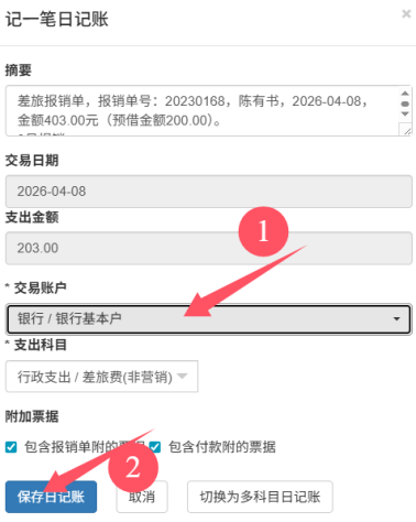 2. 进入日记账界面,收支科目、金额、经办人已自动填充,无需重复录入;选择交易账户后,点击保存日记账,下图所示: