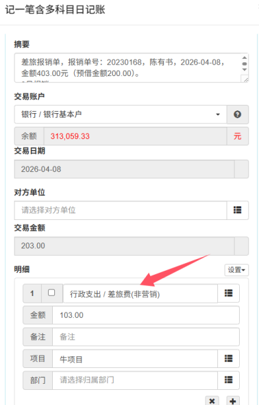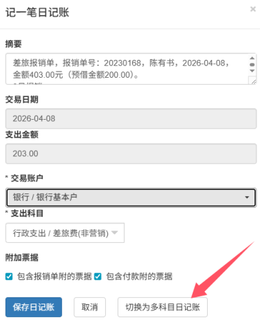 3.若报销单涉及多科目、多项目(如差旅费 +招待费 ),点击 【切换为多科目日记账】,拆分金额、选择对应科目与项目后保存;下图所示: