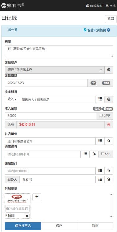 3. 点击「保存」,系统会自动生成一笔日记账收入,无需再到「日记账」模块重复录入;下图所示: