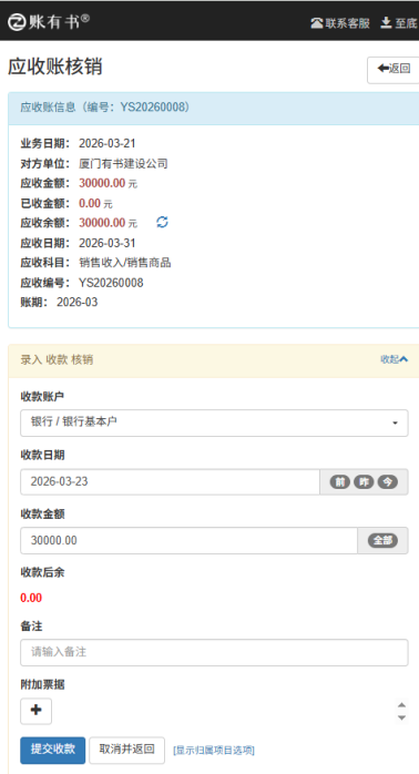 2. 点击该记录右侧的「核销」按钮,录入收款金额、收款日期;