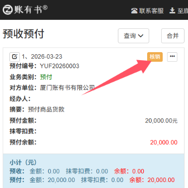 7.实际采购到货时,进入“预收预付”,找到厦门账有书有限公司的预付记录,并点击“核销”,点击“选择核销方式”,选取“通过其他方式核销”